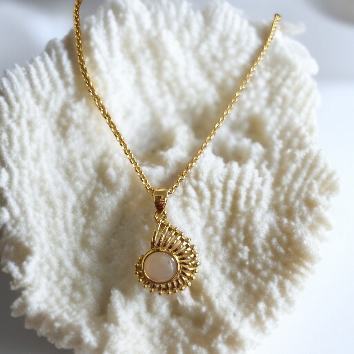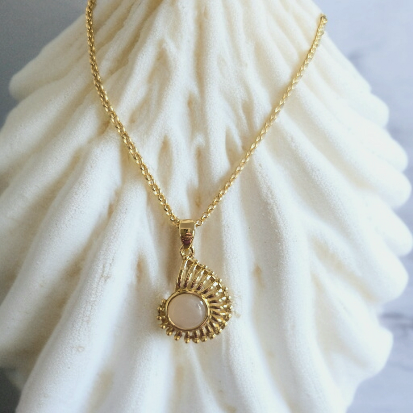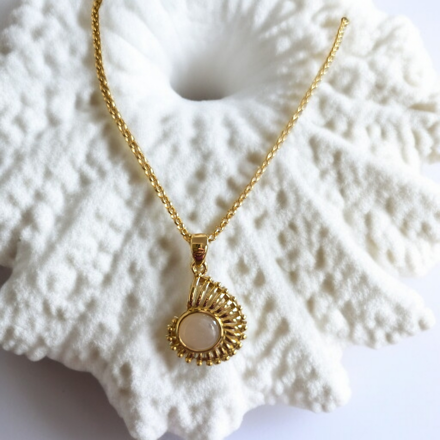This stunning necklace was inspired by the beautiful colours of the Oceans shore and unique shape and lines of the Nautilus Shell.