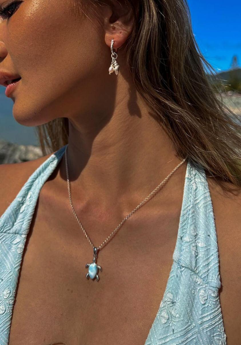 Stunning Solid .925 Sterling silver Turtle Necklace setted with genuine Blue Larimar Stone from the Dominican Republic.
